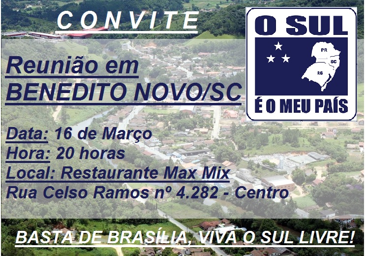 No dia 16 de março(quinta-feira) será a vez de Benedito Novo/SC ter reunião do Movimento O Sul é o Meu País. Ela será realizada às 20h00 no Restaurante Max Mix, localizado na Rua Celso Ramos, 4282.…