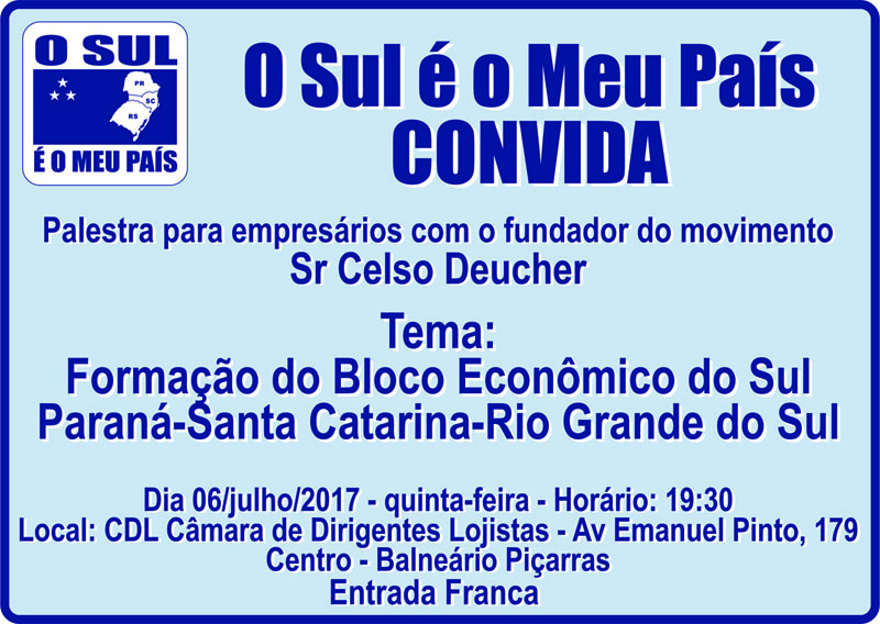 A palestra terá como palestrante um dos fundadores do movimento, o jornalista e diretor de mobilização estratégica, Celso Deucher, e terá como objetivo apresentar o movimento, sua história, motivações e propostas. Na mesma também será apresentado o Projeto de Lei de Iniciativa Popular (PLIP) Bloco Sul-Econômico, que propõem criar políticas e ações conjuntas entre os estados do PR, SC e RS, a fim de aumentar ainda mais a integração natural que já existe entre estes.