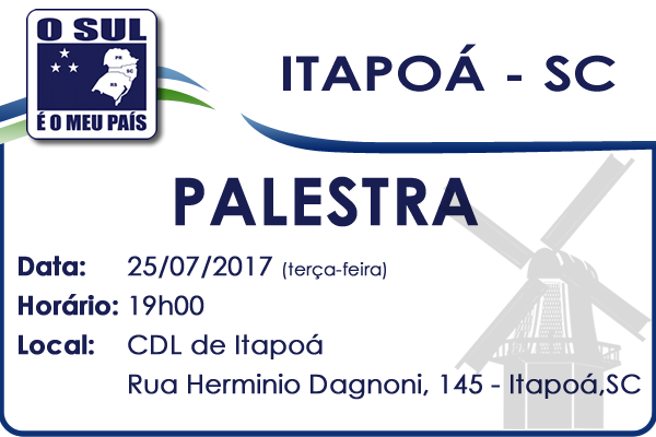No dia 25 de julho, terça-feira, será realizada uma palestra sobre o Movimento O Sul é o Meu País em Itapoá/SC. Ela acontecerá às 19h00 na Câmara dos Dirigentes Lojistas (CDL) da cidade, localizada na Rua Hermínio Dagnoni, 145.