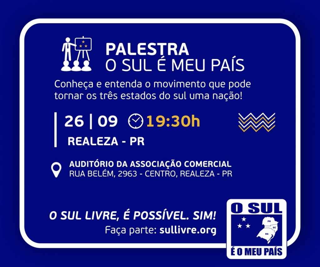 O Movimento O Sul é o Meu País a convida todos para palestra que será realizada no dia 26 de setembro (terça-feira), no auditório da Associação Comercial, com início às 19:30 horas.