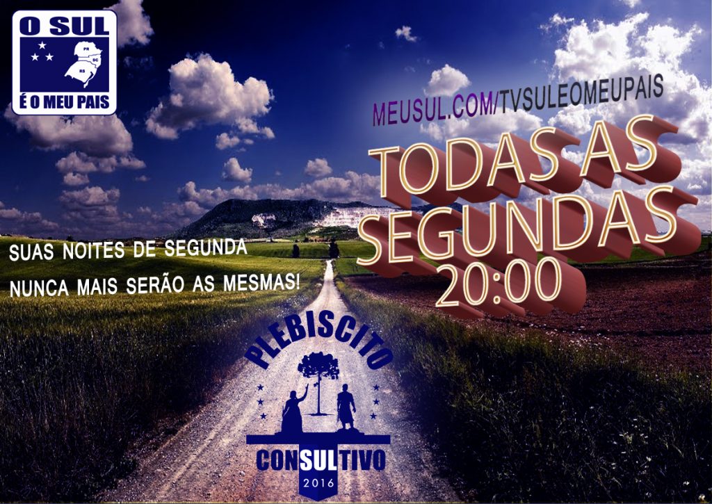 Nesta segunda dia 18-07-16 às 20:00 a TV Sul é o Meu País estará abordando assuntos do plebiscito que será realizado dia 02-10-16, se você tem dúvidas sobre o plebiscito acesse o site e deixe sua pergunta e venha fazer parte do nossa programação!
