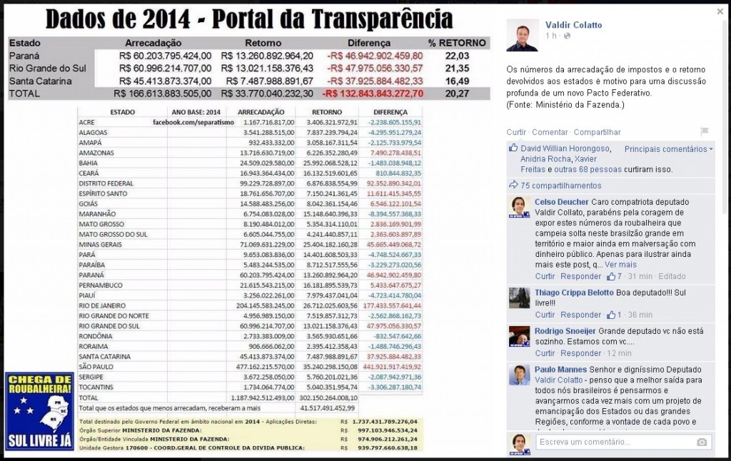 O que o deputado fez foi divulgar dados oficiais entre os dois estados e mostrar o quanto Santa Catarina é discriminada na repartição do bolo tributário. Como se esperava, a reação veio no Congresso nacional hoje onde deputados cobraram de Collato uma posição sobre o Post. Agora a noite, para reafirmar sua convicção, o deputado publicou em sua fanpage no facebook (https://www.facebook.com/deputadovaldircolatto) mais números, desta vez de todos os estados da federação, mostrando que nada tem contra o estado do Maranhão, mas que não aceita a “roubalheira” imposta pela união com o Sul. Nos dois posts, ao lado dos números aparecem banners do Movimento O Sul é o Meu País, que certamente foi o que mais gerou a “indignação” dos dirigentes da OAB, a ponto de ameaçarem o deputado de cadeia no melhor estilo nazifascista.