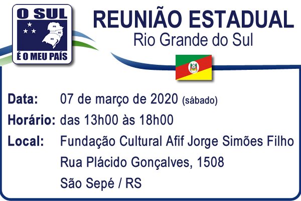 No dia 07 de março de 2020 será realizada a reunião estadual do Movimento O Sul é o Meu País no Rio Grande do Sul.
