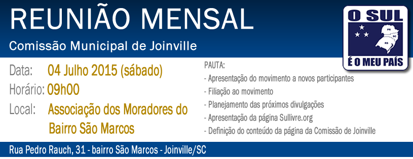 A comissão municipal de Joinville convida para a reunião mensal que realizará neste sábado (04/07/2016), às 9h00, na Associação de Moradores do Bairro São Marcos.