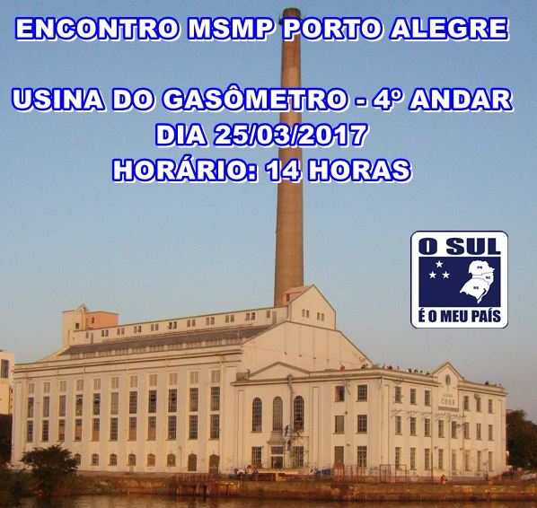 O movimento O Sul é o Meu País realizará reunião aberta ao público neste sábado, 25/03, em Porto Alegre/RS. O evento acontecerá a partir das 14h00 na Usina do Gasômetro, localizada na Av. Presidente João Goulart, 551.