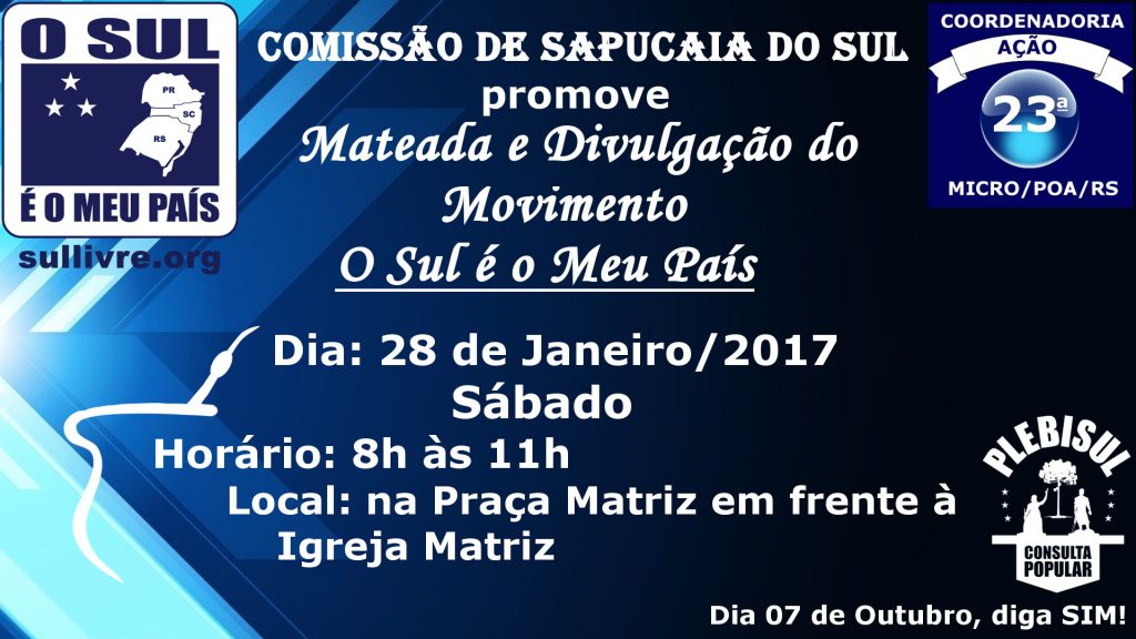 A comissão municipal de Sapucaia do Sul/RS promoverá neste dia 28/01, das 8h00 às 11h00, uma grande mateada na praça matriz da cidade.