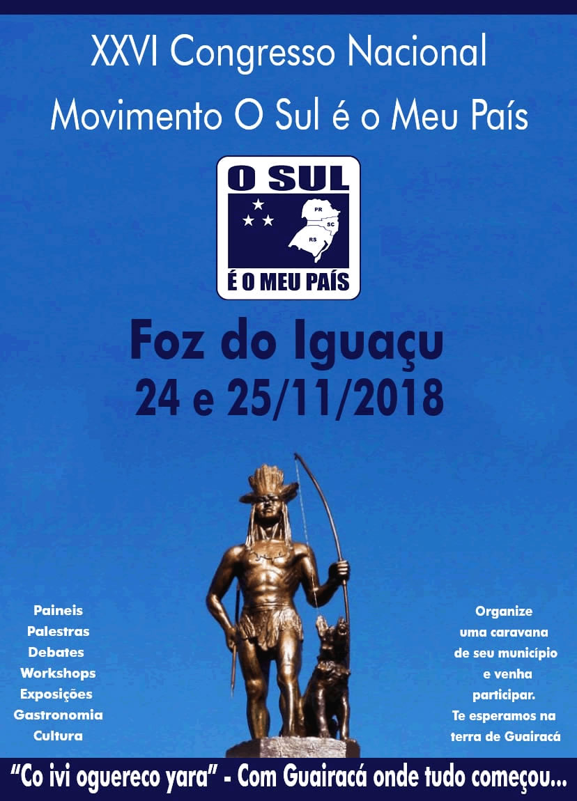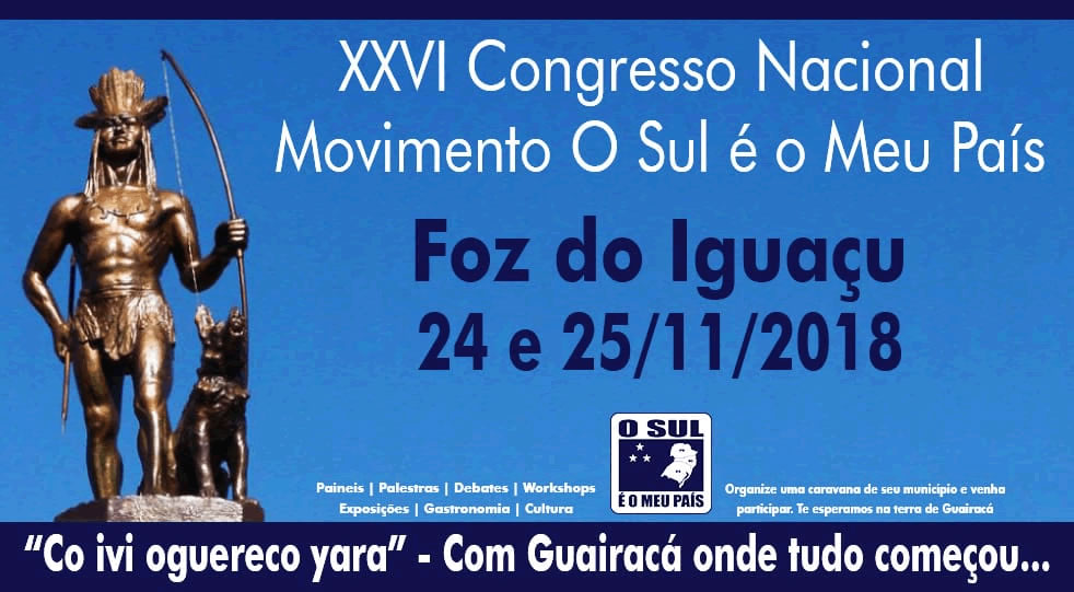 Nos dias 24 e 25 de novembro será realizado o 26º. Congresso Nacional do Movimento O Sul é o Meu País, em Foz do Iguaçu/PR. As regiões sudoeste e oeste do Paraná são aquelas onde se originam alguns de nossos antepassados e onde pela primeira vez o povo guarani se levantou contra a invasão espanhola e portuguesa. Seu símbolo principal é o Cacique Guairacá.