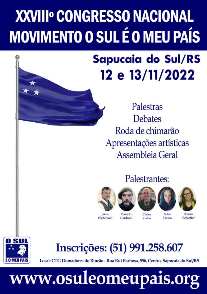 Nos próximos dias 12 e 13 de novembro, tendo como local o CTG Domadores do Rincão, em Sapucaia do Sul/RS, ativistas e lideranças do Movimento O Sul é o Meu País estarão reunidos no XXVIII Congresso Nacional do Movimento O Sul é o Meu País. Nos dois dias de evento, acontecerão palestras, debates e workshops envolvendo temas da causa Sulista, bem como vão ser tomadas importantes decisões sobre os próximos passos da entidade.